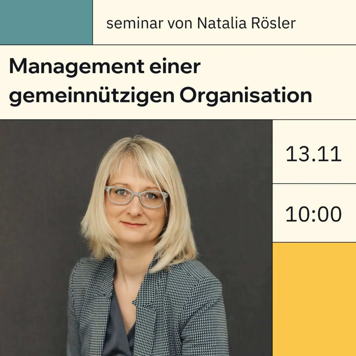 Wir laden Sie herzlich zum Seminar „Management einer gemeinnützigen Organisation“ ein, das am 13. November 2025 von 10:00 bis 15:00 Uhr stattfinden wird.